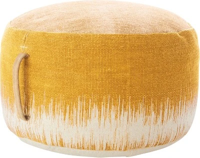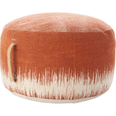 Made from cotton on a round silhouette, this Mina Victory pouf is an instant staple during relaxation time. In true contemporary fashion, its color melts into a jagged linear motif in soft ivory. Dense polyester and polystyrene beads fill the interior of this pouf for sturdy support as a seat, or as place to prop up your feet after a long day. Includes a brown cloth side handle for convenient carrying from room to room. Size: 20-in (L) x 20-in (W) x 12-in (H).
